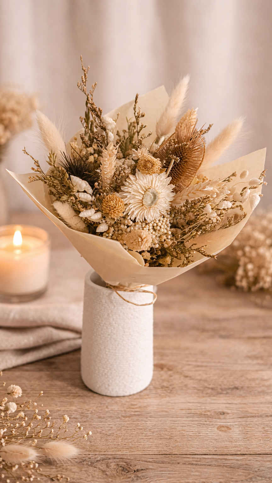Découvrez notre collection de bouquets de fleurs séchées. Composés avec soin, ils reflètent l'élégance naturelle et les couleurs délicates de la campagne bretonne. Contrairement aux fleurs fraîches, nos bouquets sont un investissement dans une décoration pérenne, un souvenir qui ne fane pas.